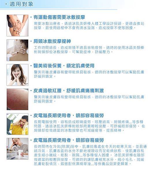 需要冰敷按摩者,透過冰肌美妍棒人工力學設計探頭,更適合手握按摩冰敷,且使用過程中不會有滴水溢漏、造成按摩不便等困擾。